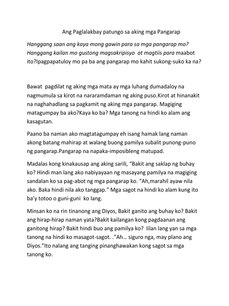 Mahilig rin siyang magluto at umawit. Minsan ay umaabot tayong nangangarap ng mga bagay na wala na halos sa. 04042020 Sanaysay tungkol sa pangarap - 2731534 Answer.