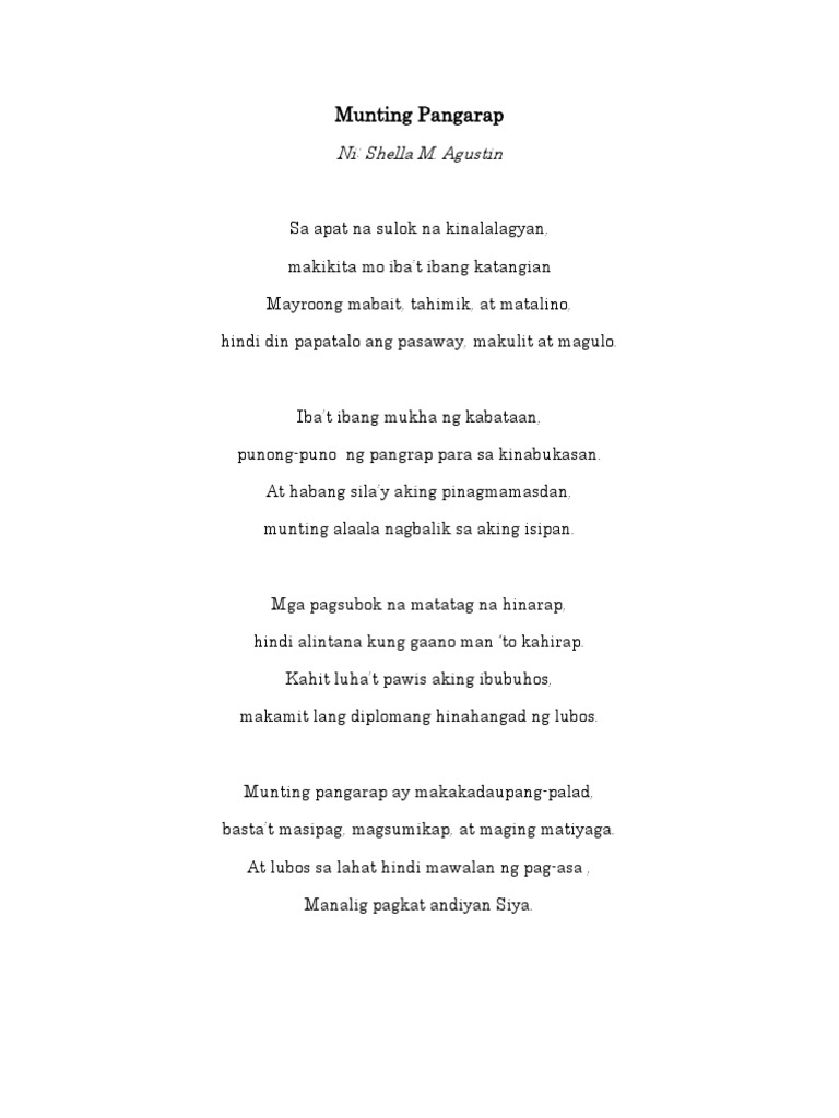 Gawin mo ang pinakamabuti mong makakaya dahil ang sikreto ngpag-asenso ay pagsisikapB. 21042021 1Ang Munting Kahon ng Pangarap 2Ang Matanda At Ang Tatay 3Ang tatay Ay Pangarap Na Bumili ng Jeepney At Ang Anak Niya Ay Nag Tinda At Nag Ipon Ng Pera Para sa Sariling Nilang Jeepney ni Tatay 4Ang Tatay Na Gusto Sana Pumunta Sana sa Saudi Arabia Pero Ang Anak Niya Ay Nag Ipon Ng Pera Para Kay Tatay. Isang tuwid at matigas na guhitang kanyang mga labing pinid nasa ano mang panalangin.