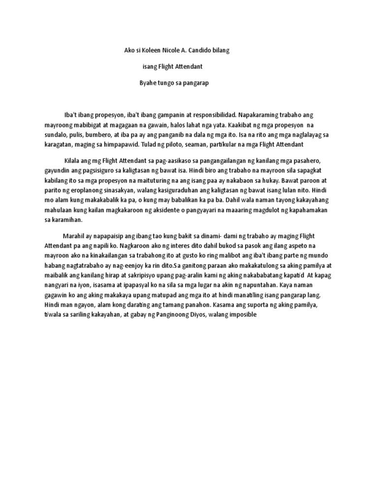 Feb 12 2018 Naging pangarap kong maging flight attendant doctor dentistpiloto at ngayon ang gusto ko na ay maging isang engineer. Pero dahil mataba ako nung bata pa ako hindi ko na tinuloy. Sep 13 2018 Gusto ko maging flight attendant kasi gusto ko makarating sa ibat ibang lugar maranasan ang ibat ibang kultura ng bawat isa.