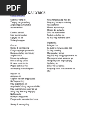 Ng Buhay ko Buhay na kay ganda Pangarap ko na makamtan ko na Sanay di na magising Kung nangangarap man din Kung ang buhay na makulay Ang tatahakin Minsan ay madarama minsan din ay luluha Di ka na maninimdim pagkat sa buhay mo ay may nagmamahal parin Iingatan ka Aalagaan ka Sa puso ko ikaw ang pag-asa Sa ting mundo May gagabay sa iyo Ang alay koy itong pagmamahal ko. Ang alay koy itong pagmamahal ko. 2017-07-22 Sa buhay kong ito Tanging pangarap lang Ang iyong pag mamahal Ay makamtan Kahit na sandali Ikaw ay mamasdan Ligayay tila ba Walang hanggan Sanay di na magising Kung nangangarap man din Kung ang buhay na makulay Ang tatahakin Minsan ay nadarapa minsan din ay luluha Di ka na maninimdim pagkat sa buhay mo ay may nag mamahal parin Iingatan ka Aalagaan ka Sa puso ko.